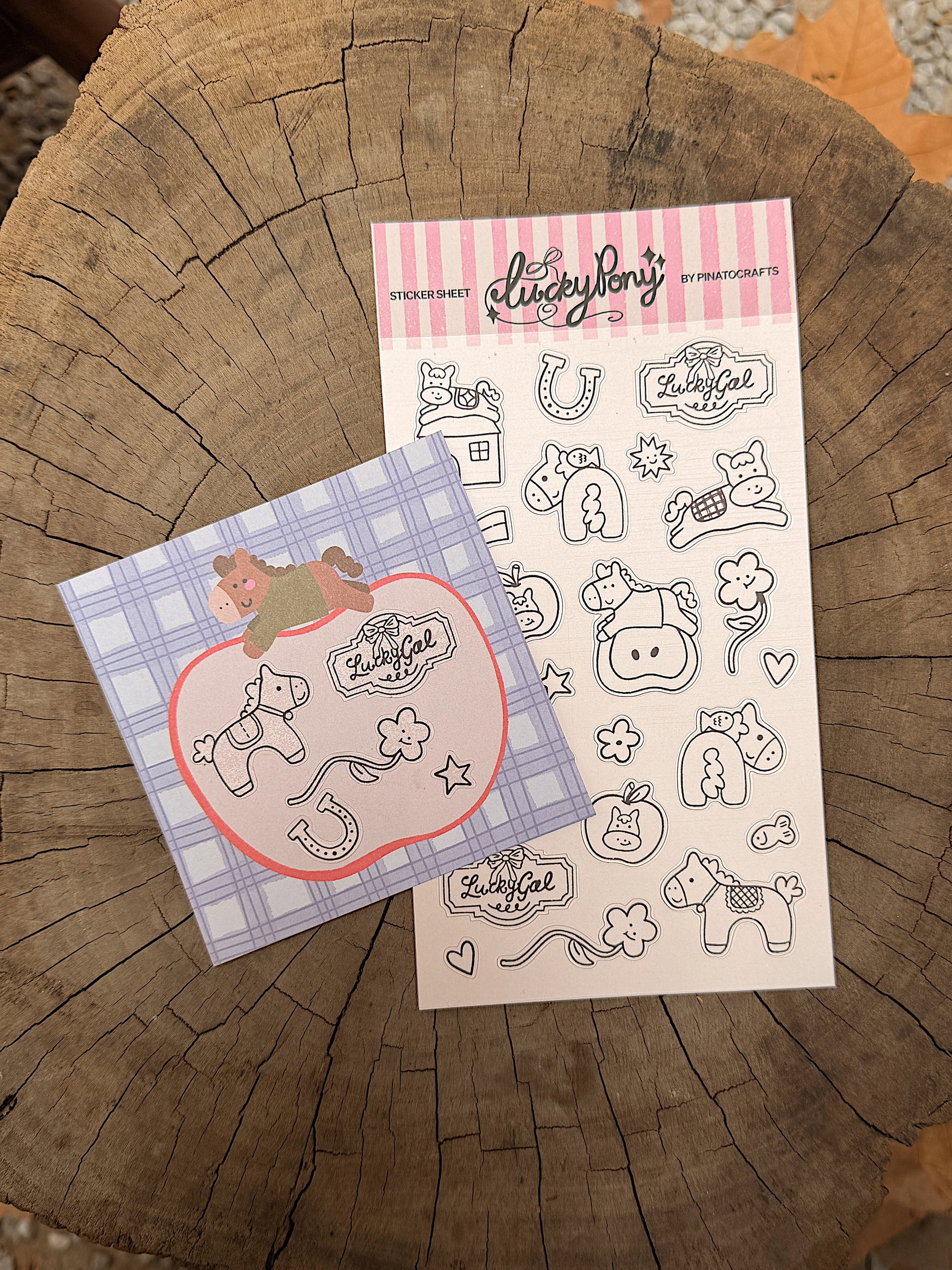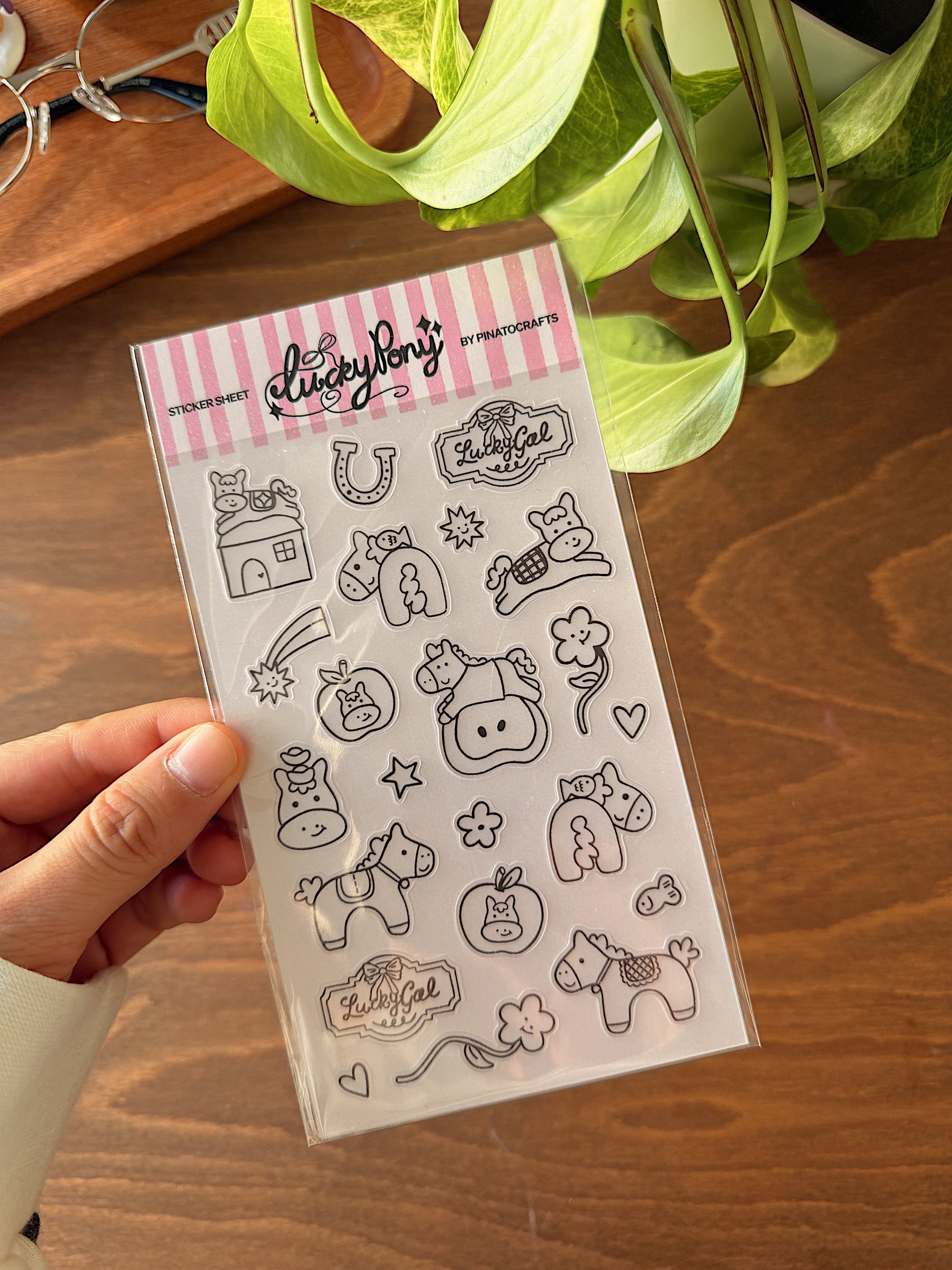 This 145 x 90mm black and white glossy sticker sheet features a Lucky Pony illustration collection made to bring a sprinkle of joy to your day.